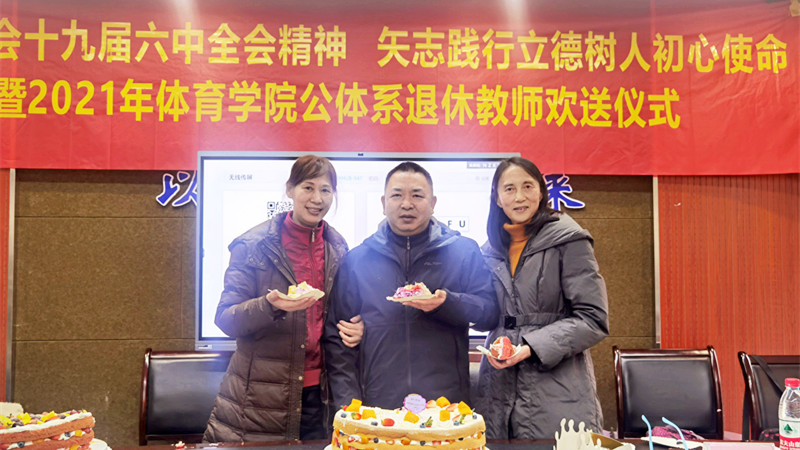 公体系的李锦、李小宁、纪建敏、赵梅四位老师今年先后退休,专门为他们举行欢送仪式。倾尽丹心育桃李,奉献韶华铸师魂,青春数十载,四位老师始终深耕于体育教学第一线,他们为学校学院的发展和学生的成才贡献出自己的力量。学院党委书记邱荣富和公体系主任冉锋分别在活动开始为退休教师致欢送词和感谢词,感谢他们为学校和学院做出的贡献,衷心希望他们退而不休,在翻开新的人生篇章的同时,常回家看看,继续为学院的发展献言献策、发挥余热。